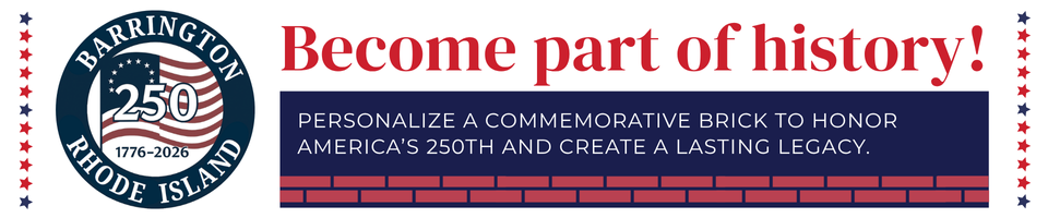 Thank you for your interest in contributing to the commemorative brick project and supporting Barrington 250 events and planning activities! Your brick will become part of a commemorative site that, paired with our town’s Liberty Tree planting, will create a lasting legacy of our town's celebrations of the 250th anniversary of American independence. We appreciate your support! Learn more about Barrington 250 at Barrington.ri.gov/250.
